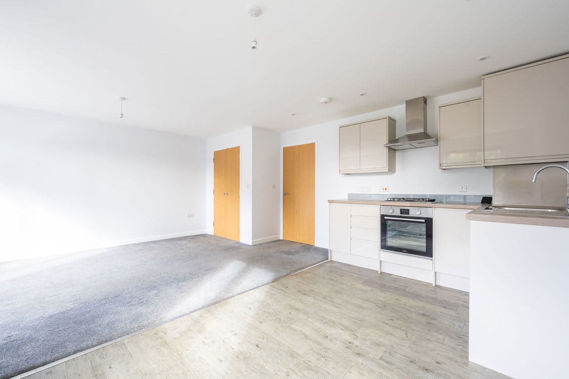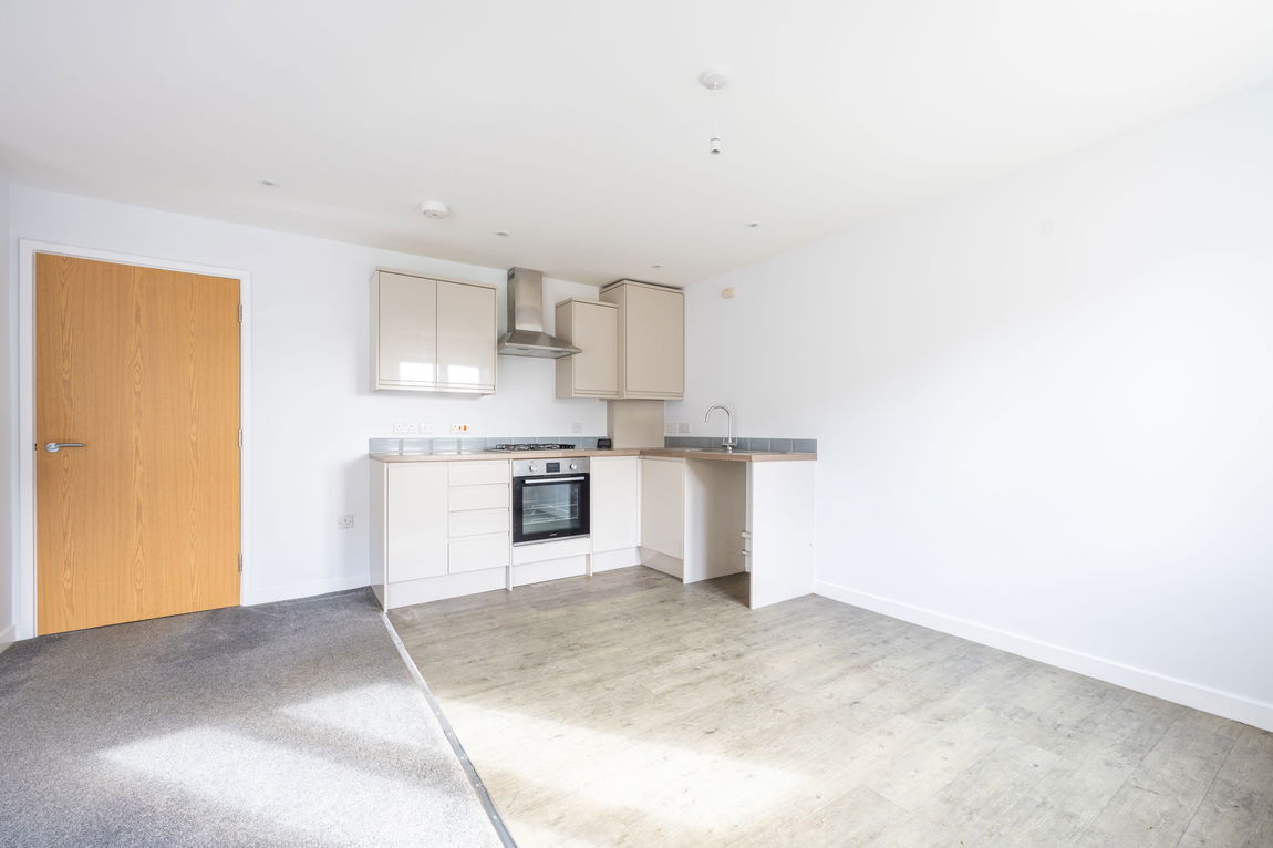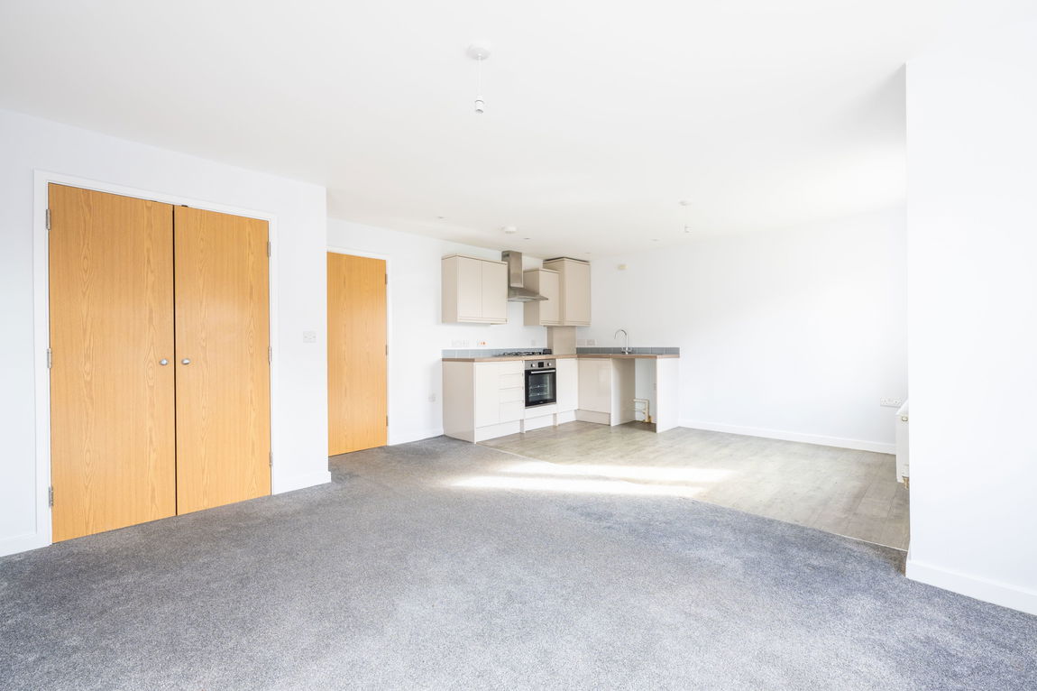 The standout feature of the apartment is the impressive open plan kitchen and living space. Two large windows allow natural light to flood the room, creating a bright and airy atmosphere throughout the day. The layout offers excellent flexibility, comfortably accommodating both living and dining furniture depending on individual needs. A useful storage cupboard provides valuable additional space for household items, helping keep the main living area uncluttered. The kitchen area is thoughtfully arranged, complementing the open plan design and making the space ideal for both everyday living and entertaining.