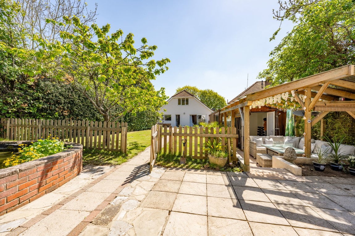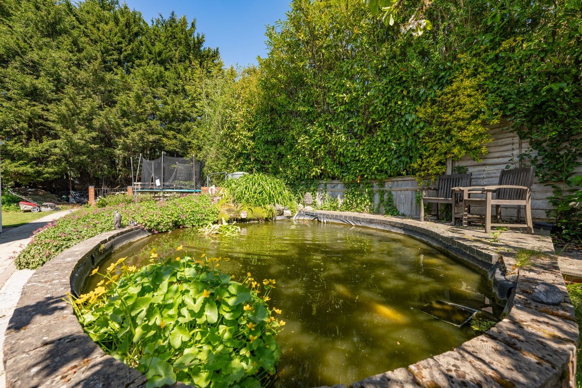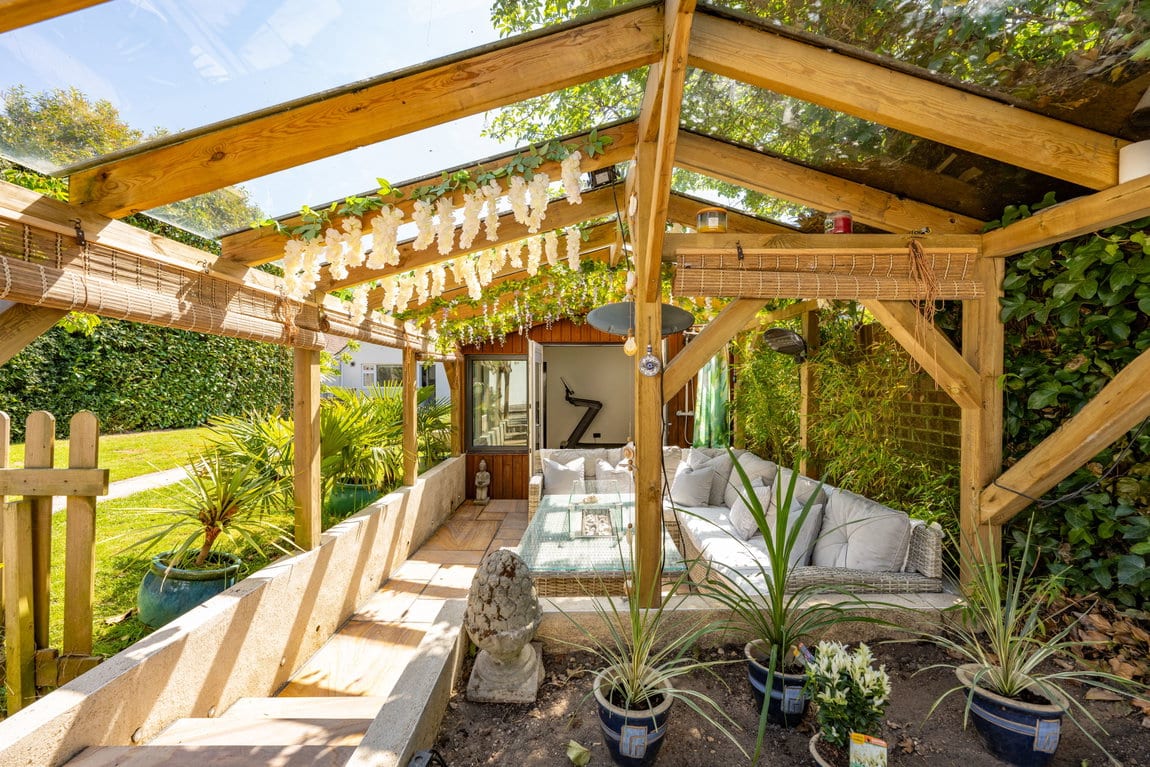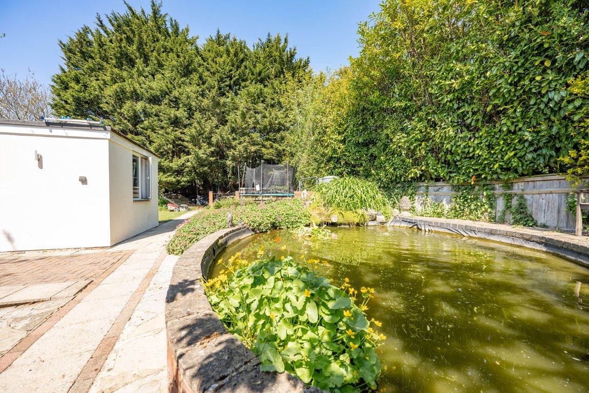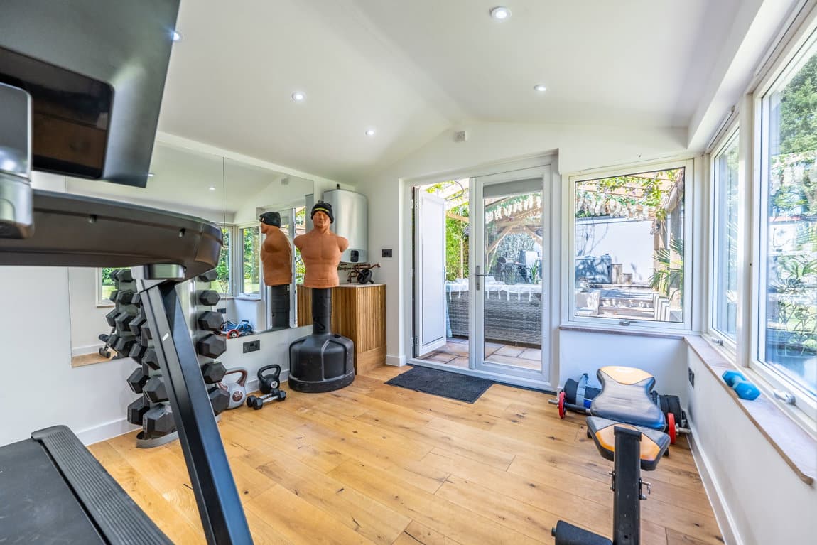 The rear garden is undoubtedly one of the property's most impressive features, extending to approximately 200ft x 40ft and offering exceptional privacy, space and versatility rarely found. Thoughtfully arranged into multiple sections, the garden provides something for everyone, whether relaxing, entertaining or enjoying family activities. A recently added outbuilding offers an excellent combination of home office and gym space, perfect for modern lifestyles. The gym opens via French doors onto a private patio area with a covered veranda, complete outside shower and pull-down blinds to create an intimate and sheltered entertaining area for use all year round. Adjacent to this is a further patio, currently home to a hot tub and perfectly suited for barbecues and social gatherings. To one side sits a stunning feature pond stocked with koi carp, creating a tranquil focal point within the garden. Further beyond is an additional garden room, currently used as a bedroom, followed by yet more private garden space, adding to the sense of scale and opportunity this outstanding plot provides.