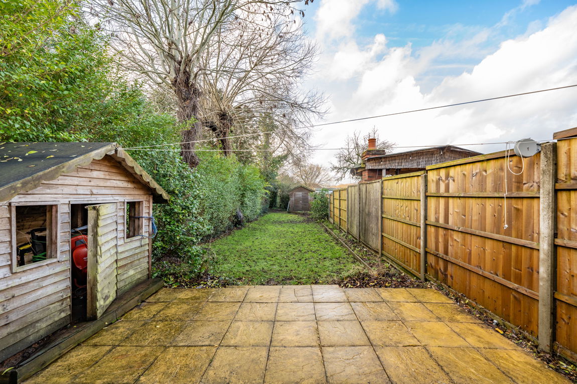 Externally, the westerly facing rear garden is a real standout feature. A patio area provides the ideal spot for outdoor seating and is accessible from both the kitchen side door and the rear reception room. Beyond this, a long stretch of lawn leads down to a shed, with an additional hidden section of garden tucked behind, creating a surprisingly spacious and private outdoor setting. A mature hedgerow runs along one side, enhancing privacy and making the most of the evening sun.
