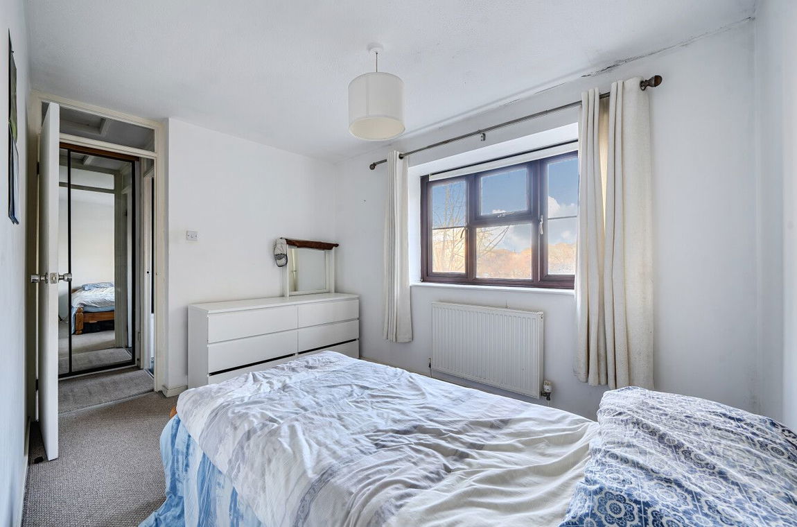 Upstairs, the landing benefits from built-in mirrored wardrobes providing excellent storage, along with access to the loft space and housing the Worcester combination boiler. The bedroom is a comfortable double and enjoys a pleasant box bay window to the front, creating a bright and welcoming space. The bathroom has also been refitted with a modern white suite including a bath with shower over, vanity wash basin and concealed flush WC, finished with stylish tiling.