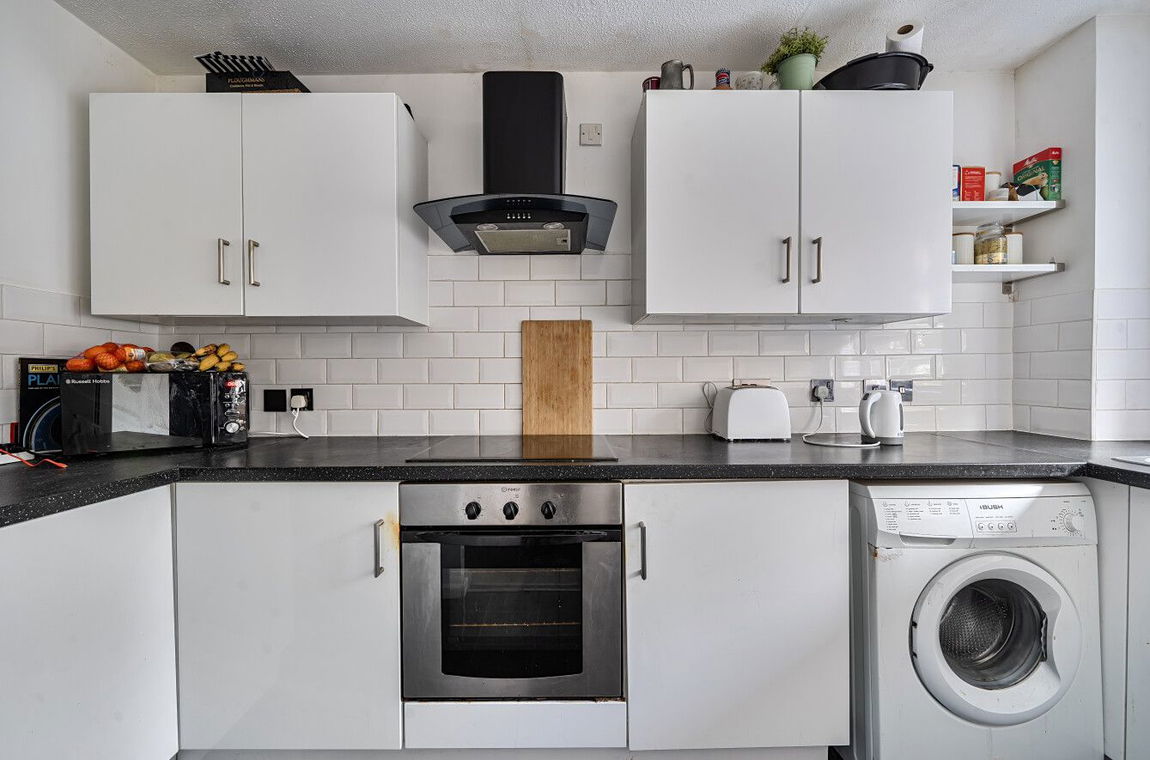 The kitchen has been refitted with a contemporary range of wall and base units complemented by modern work surfaces and tiled splashbacks. Integrated appliances include an oven and hob with extractor above, alongside space for additional white goods. A window to the front keeps the space bright and airy.