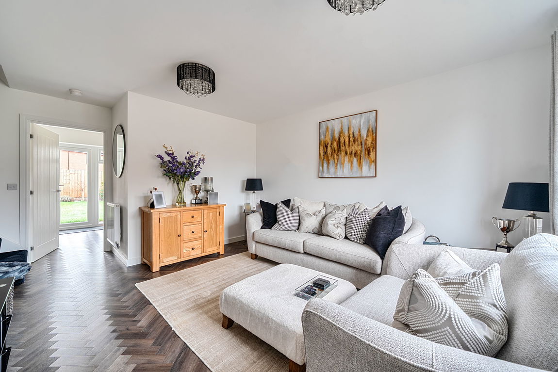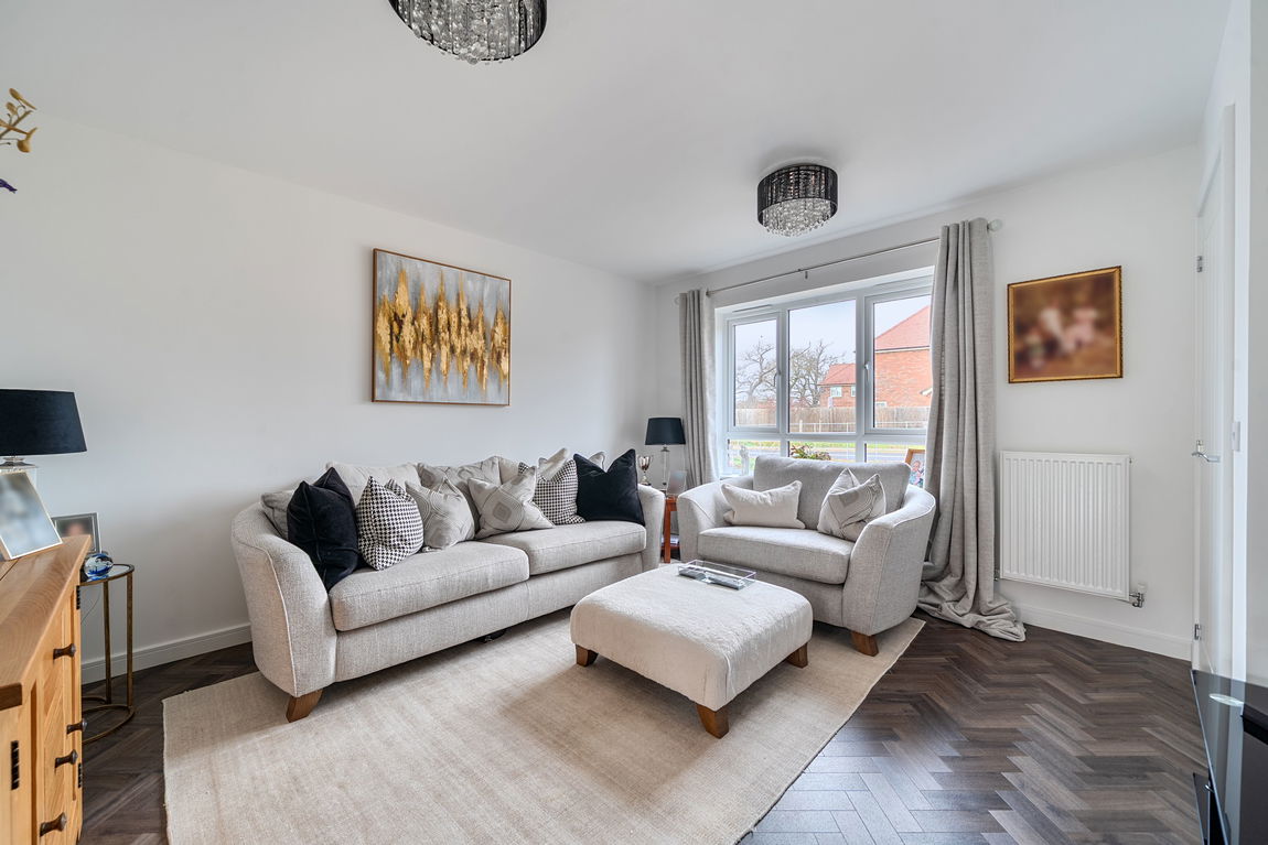 A sense of quality flows throughout the ground floor, where luxury herringbone-style LVT flooring creates a seamless and stylish finish. The main sitting room is generously proportioned, comfortably accommodating multiple sofa arrangements with additional space for storage or display furniture, all bathed in natural light from a large front-facing window.