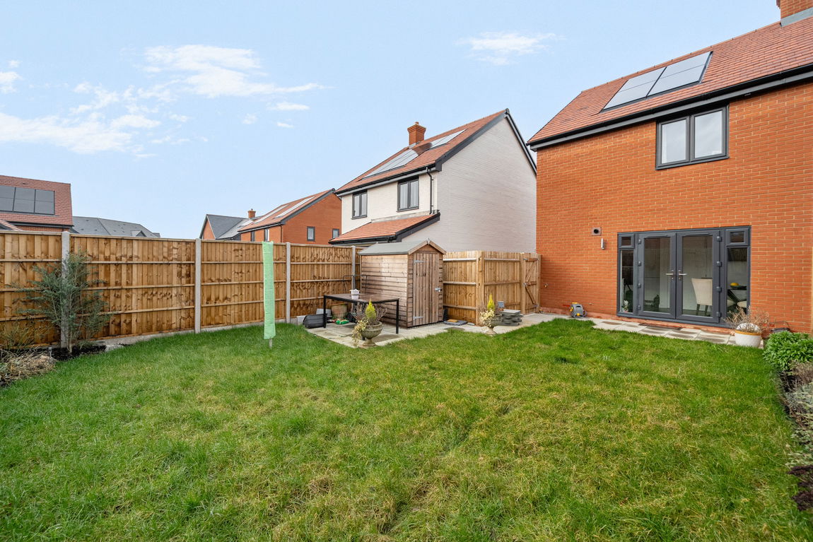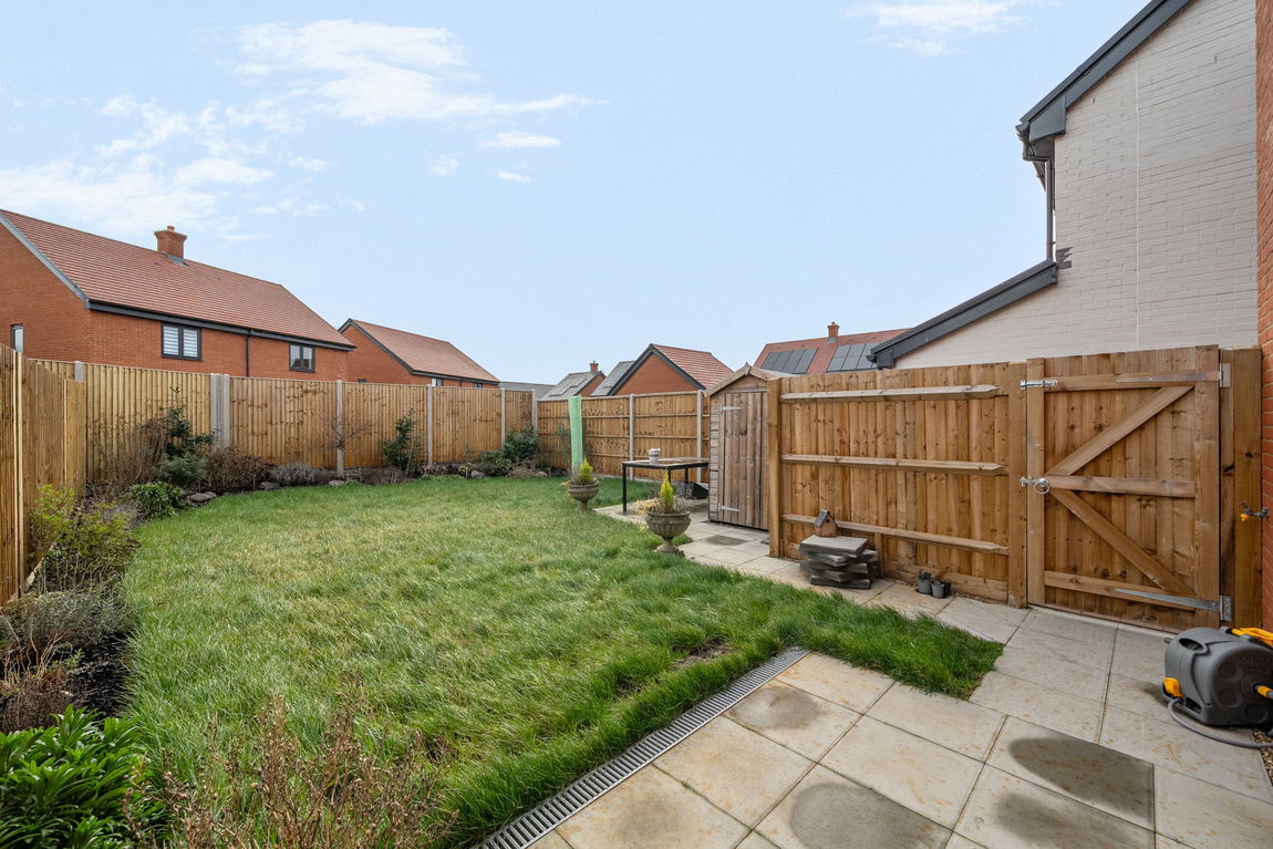 Externally, the southerly facing rear garden offers a perfect space for relaxing and entertaining, featuring a patio area, lawn, wooden shed, and convenient side gated access ideal for hosting friends and family or enjoying summer evenings.