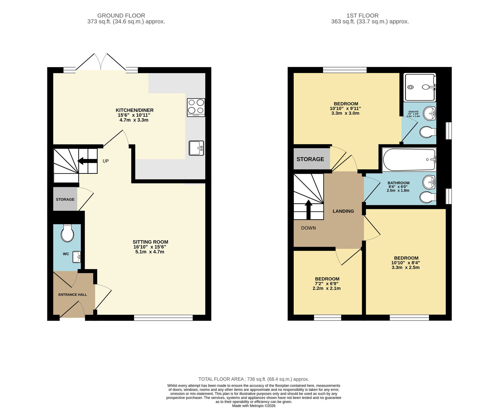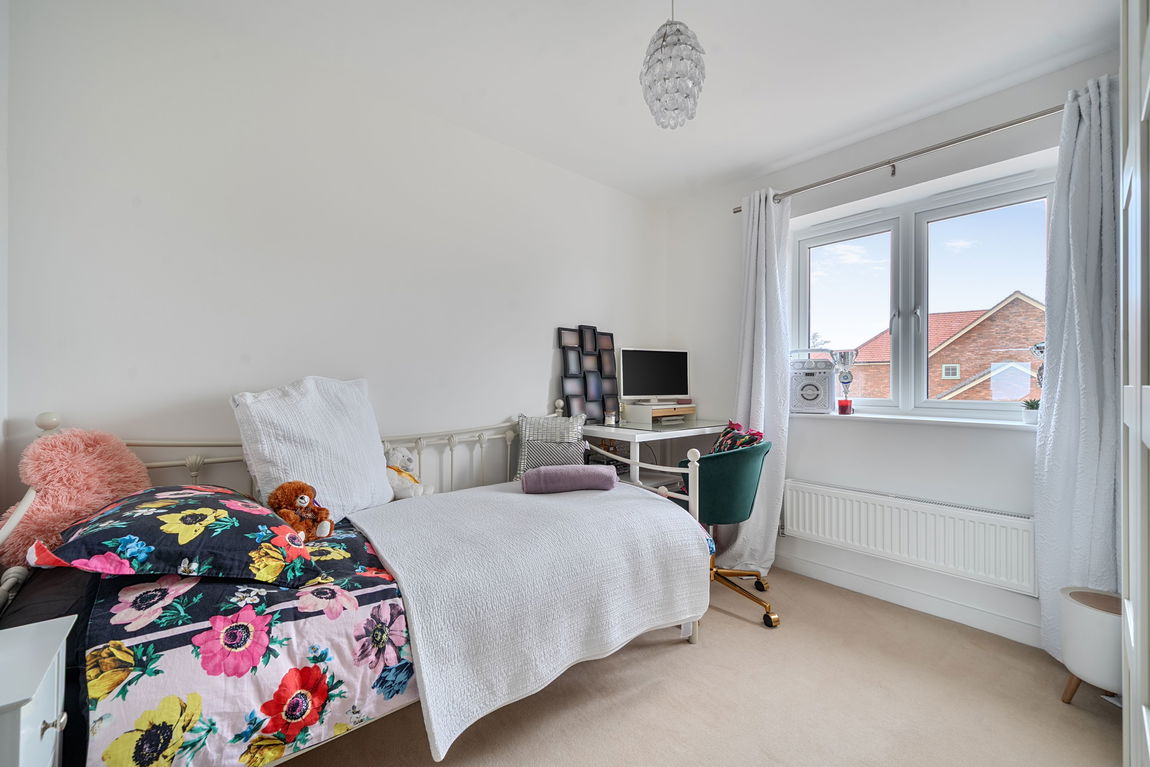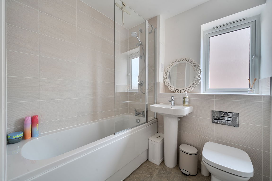 The second and third bedrooms are ideal as children’s rooms, guest bedrooms, or home office spaces. The modern three-piece family bathroom comprises a panelled bath with shower over and glass screen, ceramic basin, and hidden-cistern WC. From the landing, there is access to the partially boarded loft, complete with ladder and lighting, providing excellent additional storage.
