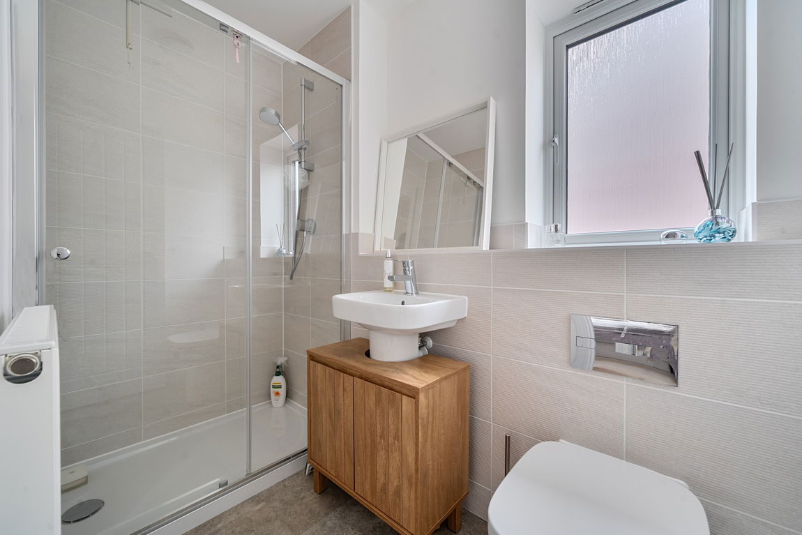 Upstairs, the first floor hosts three well-proportioned bedrooms and the main family bathroom. The principal bedroom comfortably fits a king-size bed with bedside tables and freestanding wardrobes, and benefits from additional built-in storage over the stairs. A stylish en-suite shower room completes the suite, featuring a walk-in shower with glass sliding door, ceramic basin, and hidden-cistern WC.