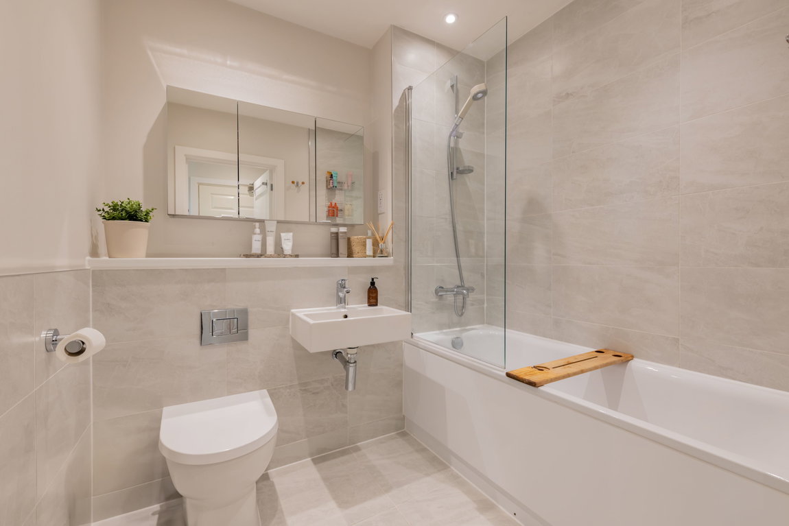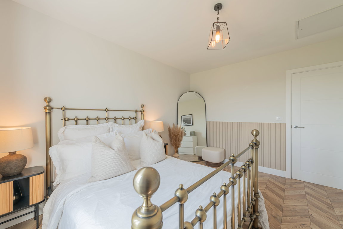 The bedroom is an excellent size, comfortably accommodating a large bed and other furniture. One of the hallway storage cupboards is currently used as a wardrobe, helping to maximise usable bedroom space. The bathroom continues the high standard of finish and features a full-size bath with overhead shower, sink, and WC, all set in a generously sized and well-presented space.