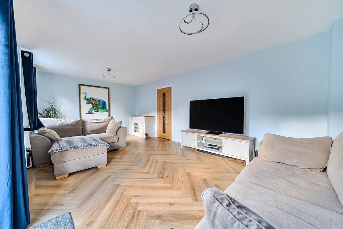 To the rear, the spacious sitting room offers a warm and welcoming atmosphere, complete with wood-effect luxury vinyl flooring and large French doors that open directly onto the sun-filled garden.