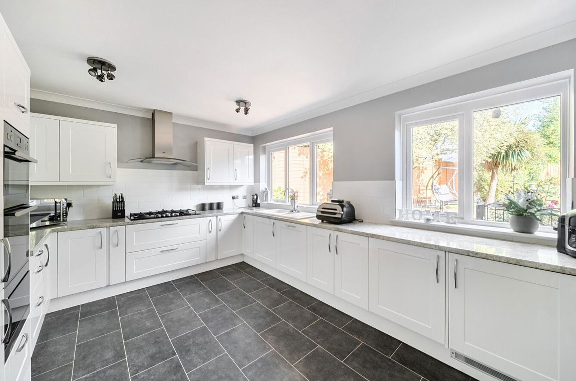The downstairs living accommodation is rounded off with a beautiful kitchen, designed with both function and style in mind, it features bespoke cabinetry, double eye-level oven with warming drawer, five-ring hob with extractor, integrated dishwasher, double sink drainer, and views across the rear garden.