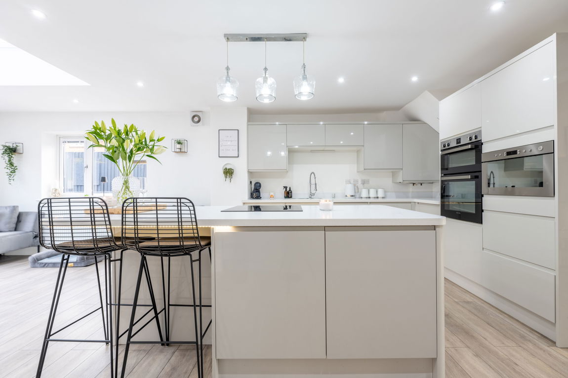 From the moment you arrive, the property makes a strong first impression. The crisp white exterior, contrasted beautifully with grey painted brickwork, matching window surrounds and front door, creates a sharp, contemporary aesthetic. A tarmac driveway comfortably accommodates two vehicles, with additional unrestricted on-road parking available. Step inside via a practical entrance hall perfect for coats and muddy shoes before entering the inviting lounge to the left. This space has been tastefully styled with a panelled feature wall, while a recessed area houses a wall-mounted TV, creating a cosy and stylish evening retreat. The true heart of the home lies to the rear. A stunning four-metre extension (completed in 2019) delivers an exceptional open-plan kitchen, living and entertaining space. Flooded with natural light from overhead skylight and enhanced by LED downlighting, this room is both bright and welcoming. Bi-fold doors seamlessly connect the interior to the garden, perfect for entertaining. The gloss grey kitchen contrasts elegantly with white worktops and is finished with wood-effect flooring throughout. A breakfast bar with seating for two, pendant lighting, under-worktop illumination and generous storage complete the look. Integrated appliances include a dishwasher, chest-height oven, microwave and grill, while the spray-function tap is a practical finishing touch. A panelled media wall adds a premium feel to the living area.