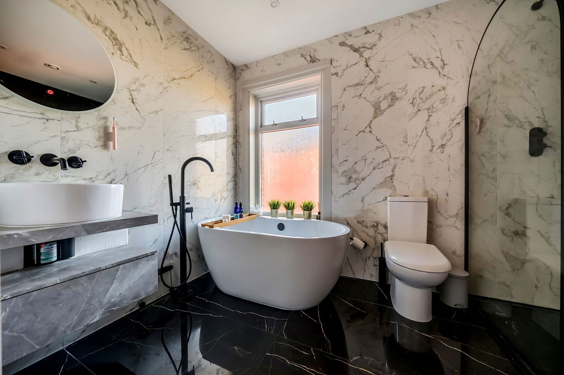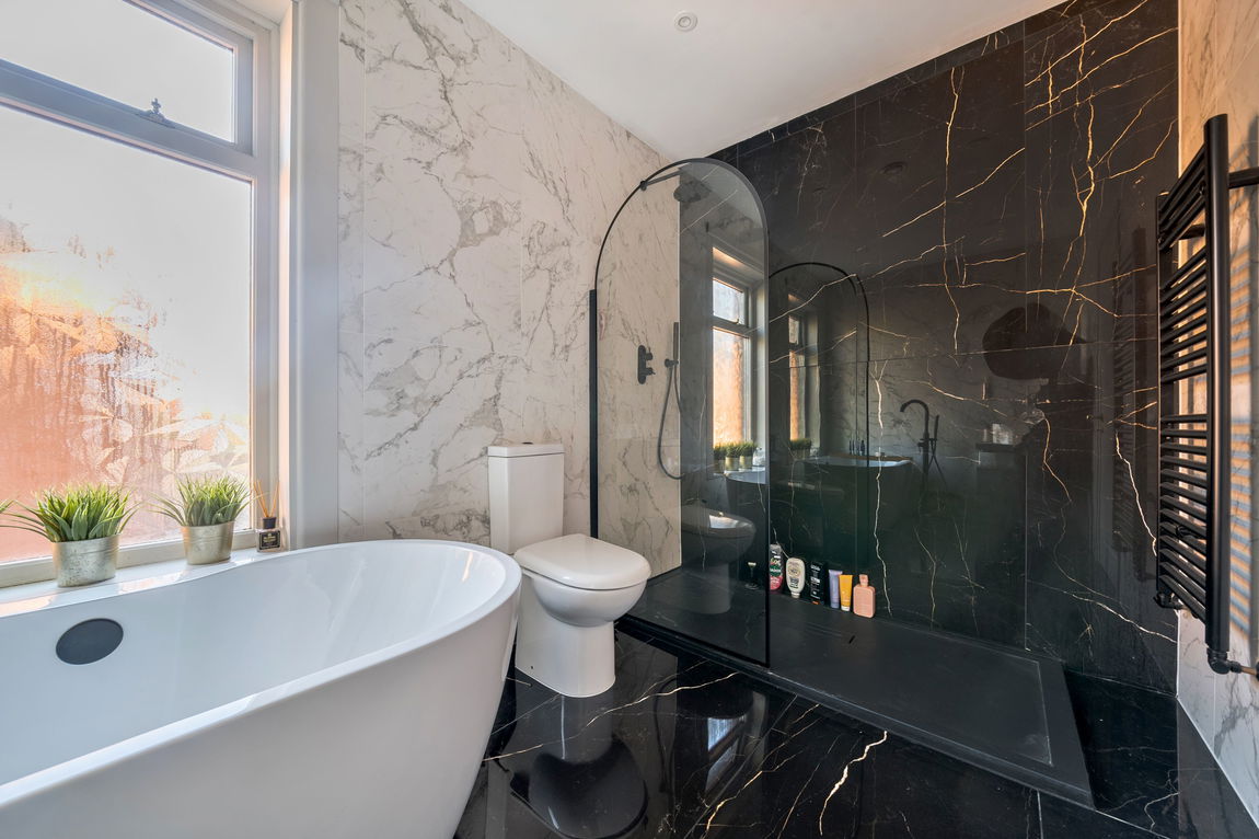 The luxurious four-piece family bathroom is finished to an exceptional standard, showcasing striking marble-effect wall and floor tiling. It includes a large walk-in shower with glass screen and rainfall thermostatic shower, a freestanding bath with floor-mounted swan-neck mixer tap, a contemporary countertop sink with storage beneath and hidden shaver socket, and a WC.