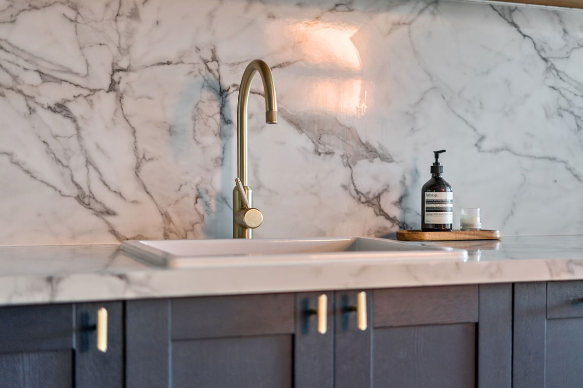 At the heart of the home sits a practical utility room, complete with integrated washing facilities, a ceramic sink with elegant swan-neck mixer tap, and a convenient downstairs WC.