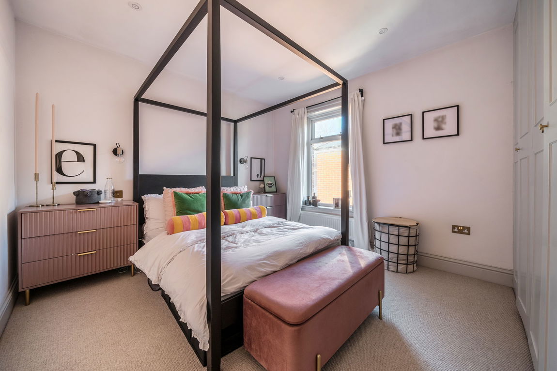 Upstairs, the property offers two generous double bedrooms. The main bedroom, positioned at the rear, benefits from built-in wardrobes and plenty of space for additional furnishings. The second bedroom is also well proportioned, featuring a built-in wardrobe cleverly positioned over the stairs.