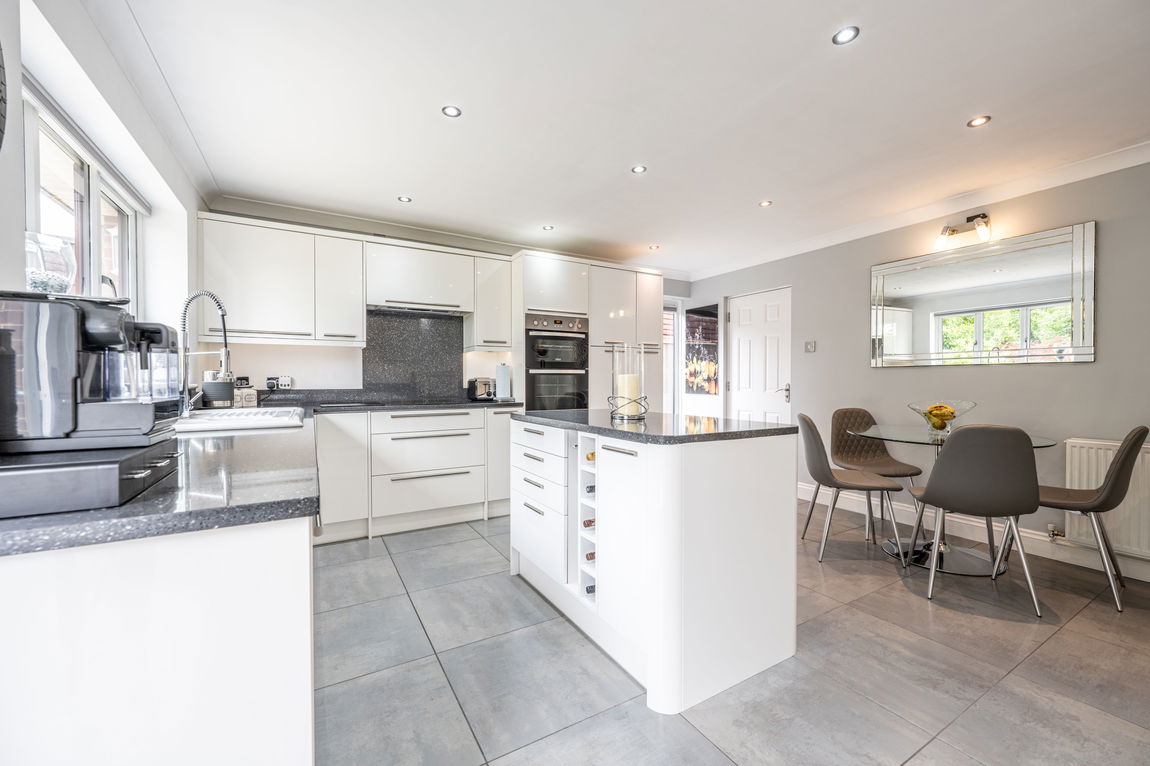 Flowing seamlessly from here is the show-stopping kitchen—recently extended and thoughtfully designed with high-spec finishes. It boasts a central island, wrap-around units, integrated appliances, double oven, 4-ring induction hob, and even space for a cosy breakfast table. Large windows allow sunlight to pour in, creating a bright, welcoming atmosphere. A separate utility room adds practicality and leads through to the original garage, retained for excellent storage.