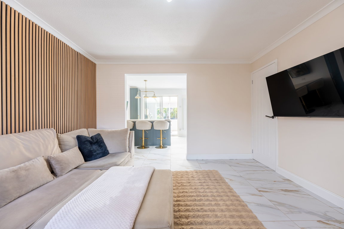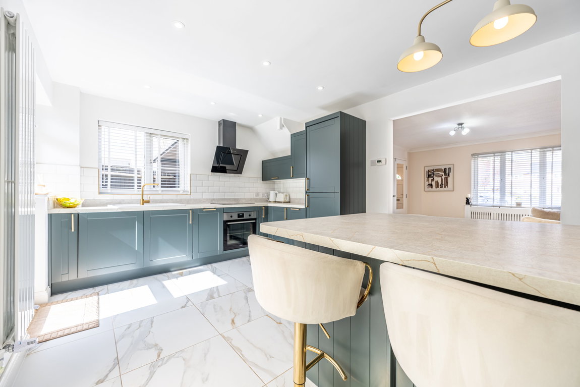 Positioned at the top of St George Close, this renovated semi-detached home has been thoughtfully reworked to deliver exactly what modern buyers are searching for space, flow, and finish. The standout feature is without question the reconfigured rear now a stunning open-plan kitchen, dining and living space that instantly feels like the heart of the home. The kitchen itself is finished in a sleek green shaker style, elevated with gold accents and a central island that comfortably seats up to six perfect for everything from family breakfasts to entertaining guests. Integrated appliances, a modern extraction system and a stylish brick slip splashback tie the whole look together, while marble-effect tiled flooring and crisp white walls keep the space light and contemporary. To the front, a beautifully presented living room offers a more relaxed retreat, complete with a striking feature panel wall and continued tiled flooring for a seamless feel throughout the ground floor. There’s also a conservatory to the rear ideal as an additional reception space, home office or playroom—featuring a characterful brick feature wall and direct access out to the garden.