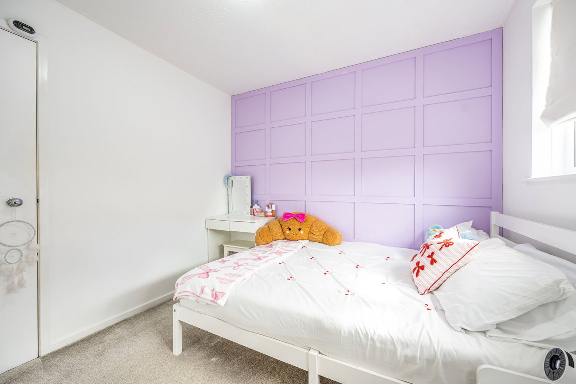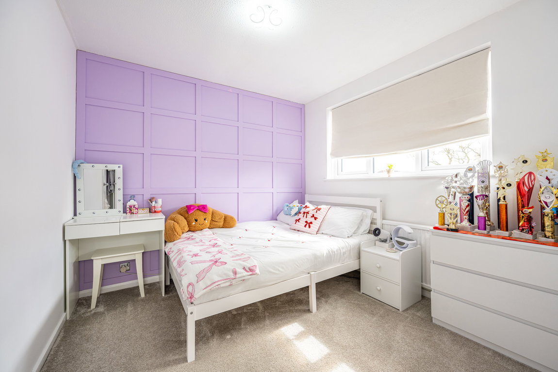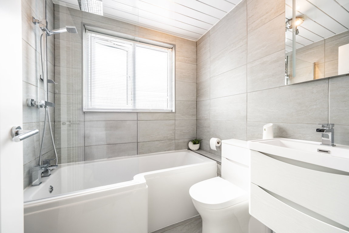 Upstairs, the property continues to deliver. Three well-proportioned bedrooms all benefit from built-in storage something buyers will instantly appreciate. The family bathroom is finished to a high standard with full-height grey tiling, white sanitaryware and the flexibility of both a traditional bath and rainfall shower.